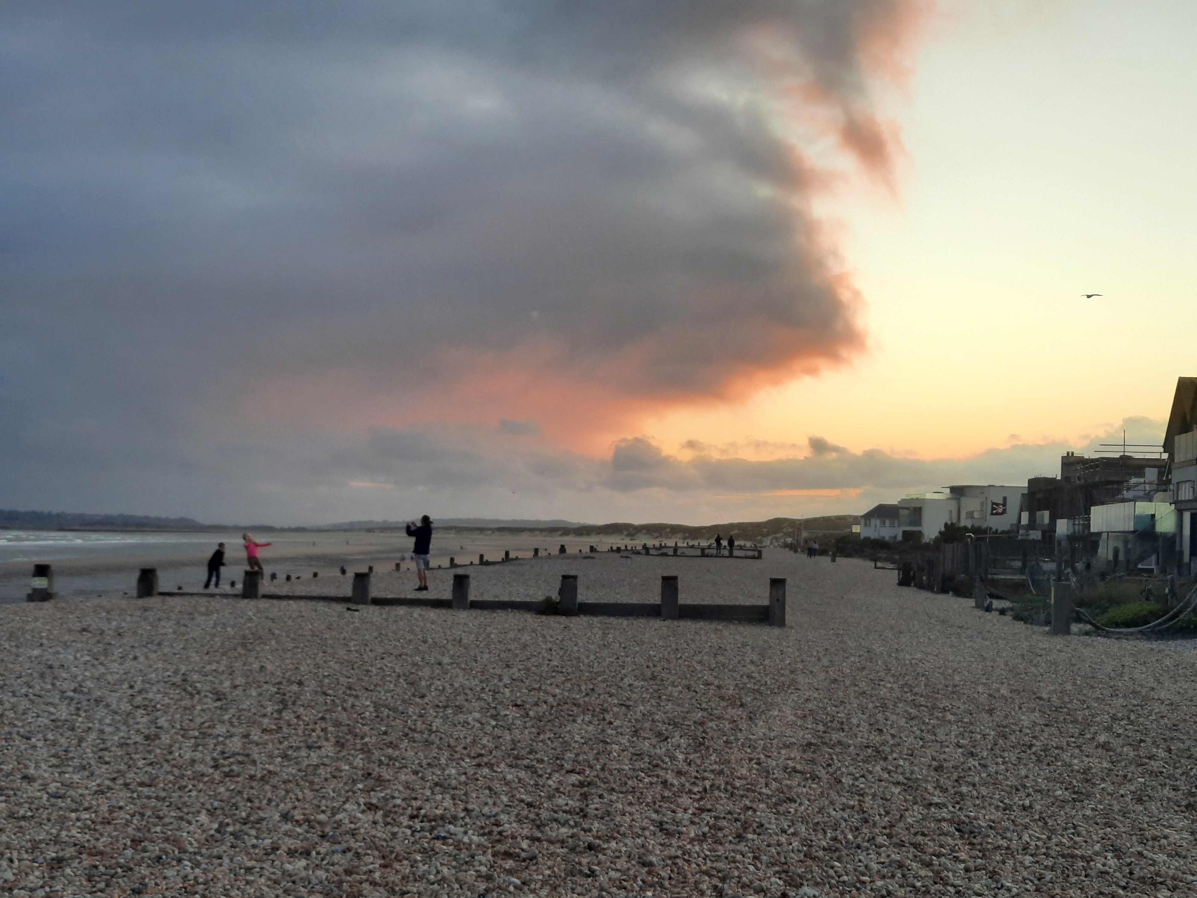 Passers-by seem to move vertically, the crunching sound of their footsteps magnified by the expanse of pebbles. The sea, a long way off and separated from the pebble beach by 100 or more yards of damp sand, murmurs lazily. Occasional voices, children, dogs, seagulls, break the calm. An incessant wind cools the air but is less noticeable at ground level. Brightly coloured kites soar above, straining to break away from their tautly stretched cords.